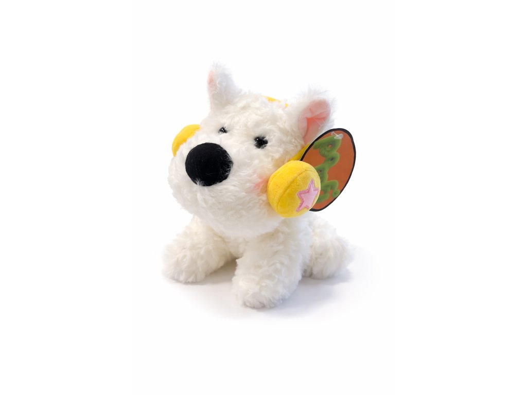 PLIŠOVÝ PES SE ŽLUTÝMI SLUCHÁTKY